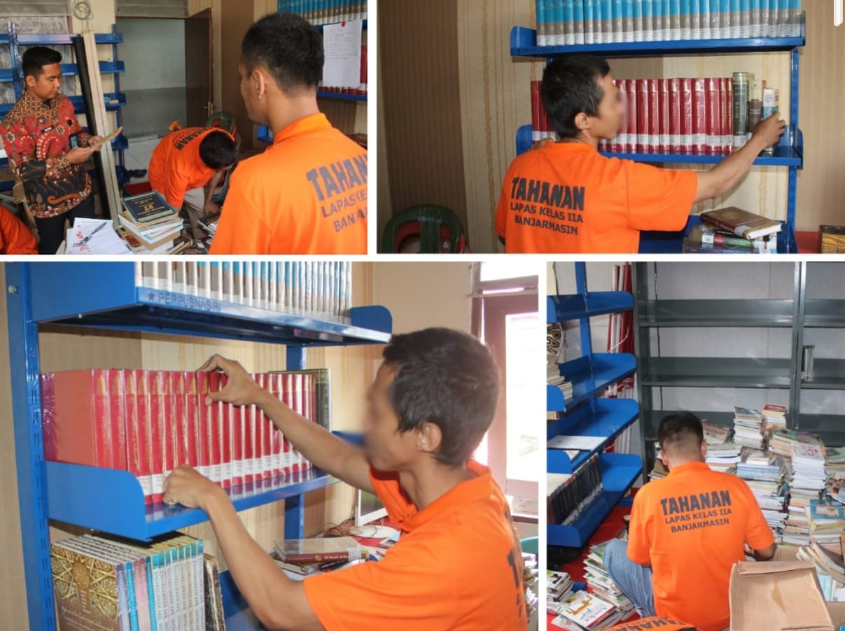 Warga binaan pemasyarakatan (WBP) tampak merapikan susunan buku di rak buku perpustakaan Lembaga Pemasyarakatan (Lapas) Kelas IIA Banjarmasin, Kamis (21/08). Kegiatan ini dilakukan dengan pendampingan Staf Bimkemaswat, Salman Farsi.