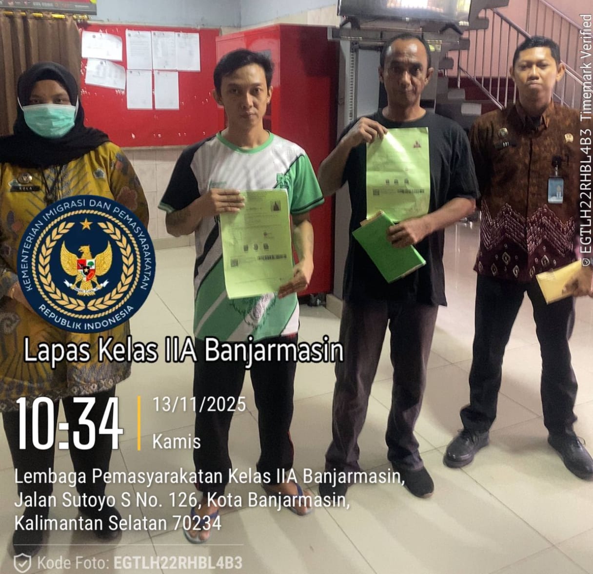 Dua Warga Binaan Pemasyarakatan (WBP) Lapas Kelas IIA Banjarmasin resmi kembali ke masyarakat pada Kamis (13/11). Satu WBP memperoleh kebebasan melalui Cuti Bersyarat (CB), sementara satunya lagi melalui Pembebasan Bersyarat (PB).