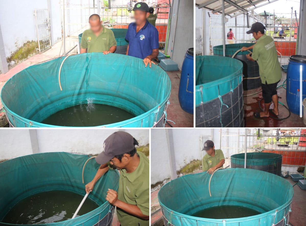 Sejumlah warga binaan Lapas Kelas IIA Banjarmasin pada Rabu (13/08) pagi terlihat kompak melakukan pembersihan kolam bioflok budidaya ikan lele yang berada di area pembinaan kemandirian. Kegiatan ini merupakan bagian dari perawatan rutin untuk menjaga kualitas air dan kesehatan ikan.