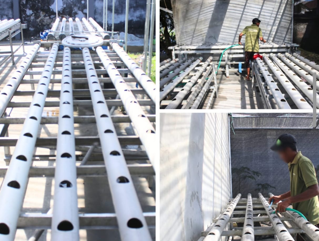 Pembersihan ini dilakukan untuk mempersiapkan penanaman komoditas baru berupa selada dan seledri. Seluruh pipa dan media tanam yang sebelumnya digunakan dibersihkan secara menyeluruh agar tetap higienis dan optimal untuk pertumbuhan tanaman selanjutnya. Proses ini memakan waktu satu hari penuh.