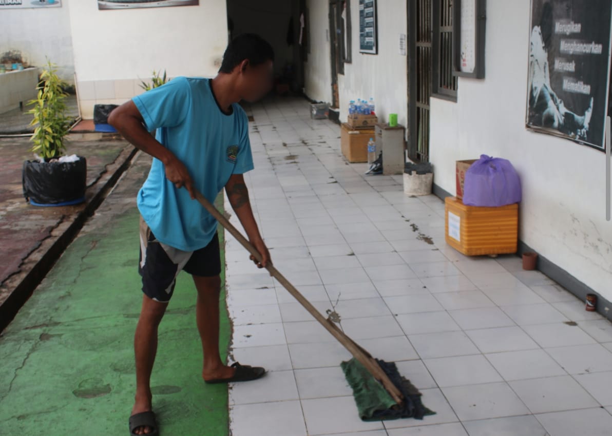 Salah satu tamping kebersihan, Alfi, tampak aktif menyapu dan mengepel lorong blok bersama rekan-rekannya. Ia mengaku senang bisa berkontribusi langsung untuk menciptakan kenyamanan di lingkungan blok.