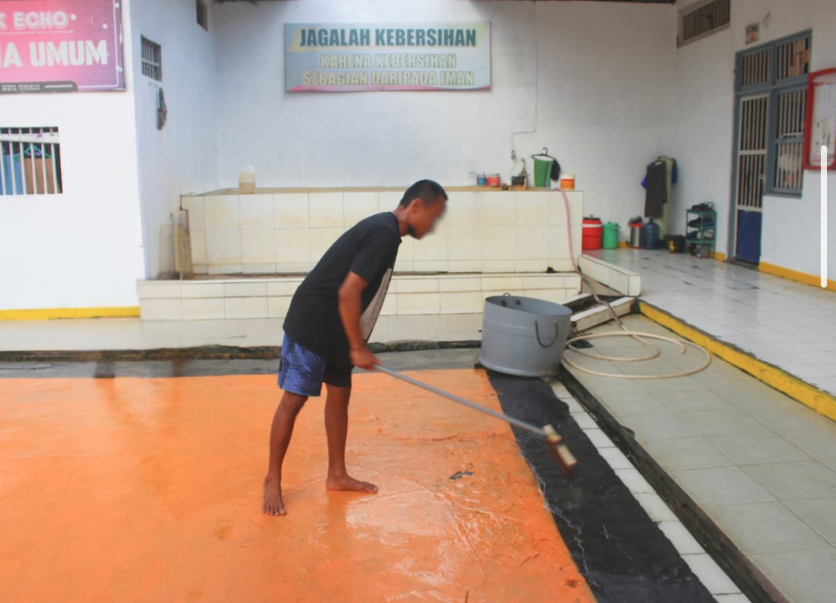 Kegiatan ini mencakup pembersihan bak sampah, taman di depan blok, saluran got, lantai blok, hingga area sekitar hunian, dengan melibatkan 9 orang tamping kebersihan yang dipimpin oleh seorang koordinator tamping. Mereka bertugas membagi peran, menjaga kebersihan lingkungan blok, serta memastikan pelaksanaan tugas berjalan tertib dan efisien.