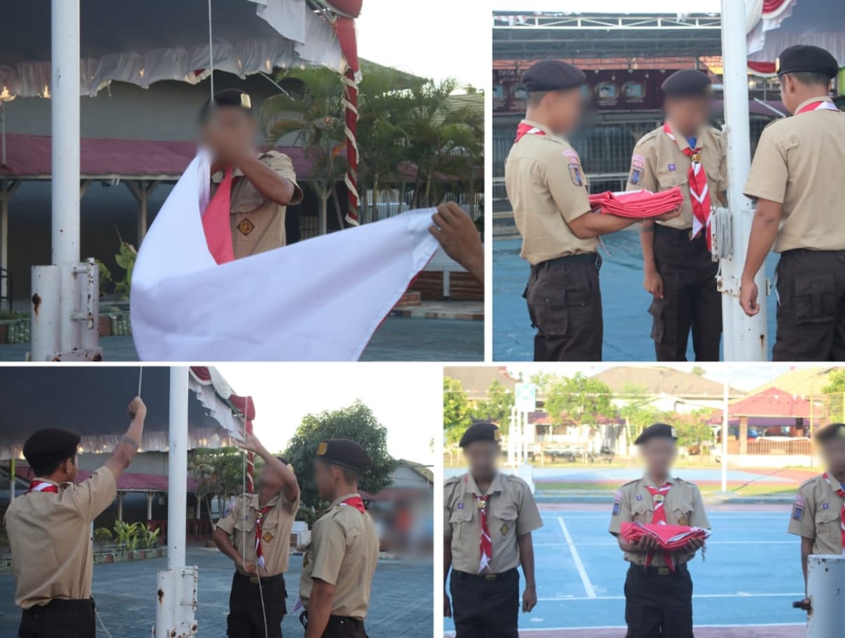 Suasana khidmat tampak di Lapas Kelas IIA Banjarmasin saat pelaksanaan penurunan bendera Merah Putih pada Jum’at sore (29/08). Prosesi ini dilaksanakan dengan penuh tanggung jawab oleh tiga anggota Pramuka Warga Binaan Pemasyarakatan (WBP) yang bertugas menurunkan bendera.