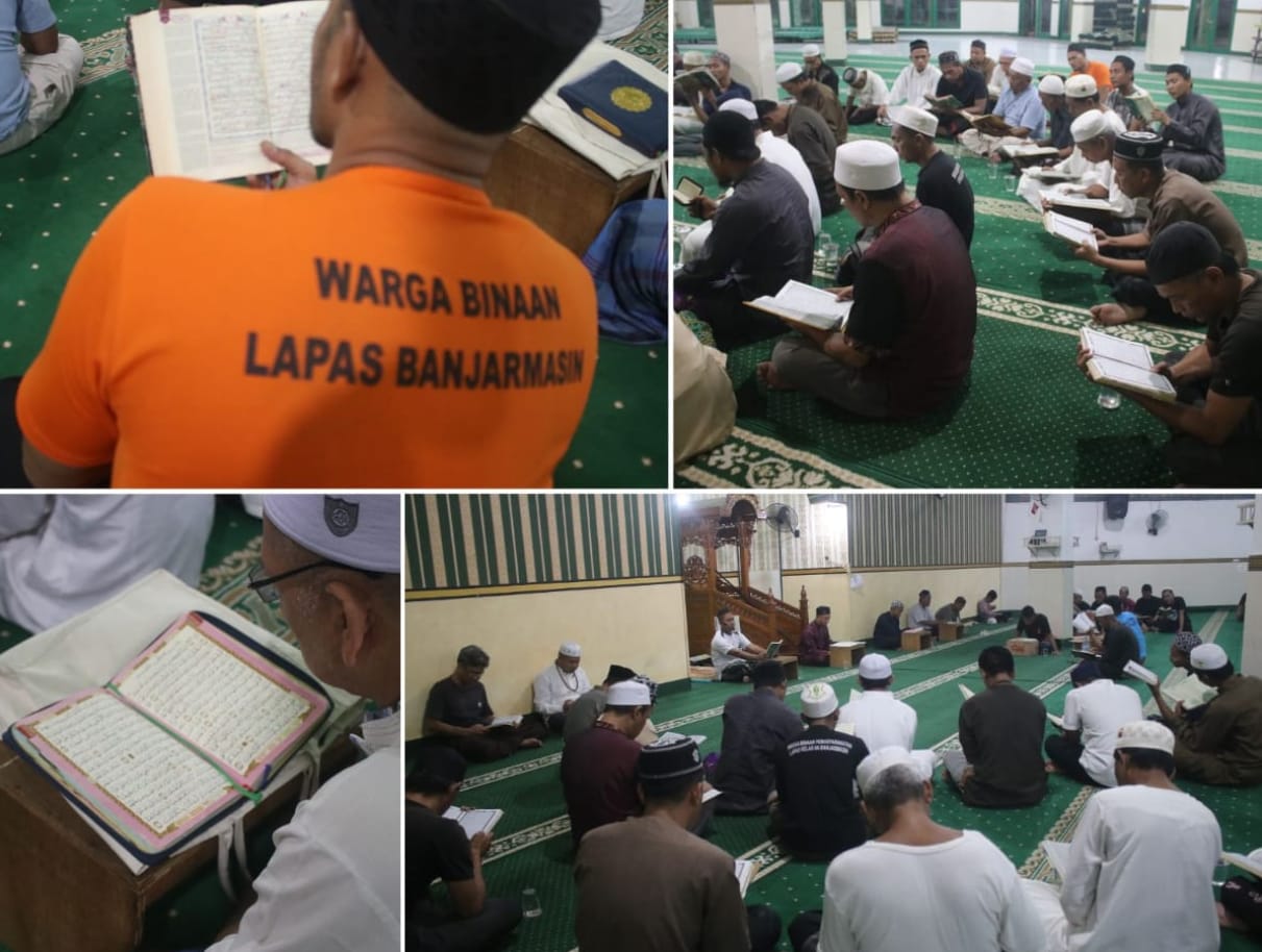 Dalam suasana penuh kekhusyukan, Warga Binaan Pemasyarakatan (WBP) yang tergabung dalam Komunitas Santri WBP Lapas Kelas IIA Banjarmasin melaksanakan kegiatan rutin pembacaan Surah Al-Kahfi di Masjid Baabud Taqwa, Kamis malam (18/09).