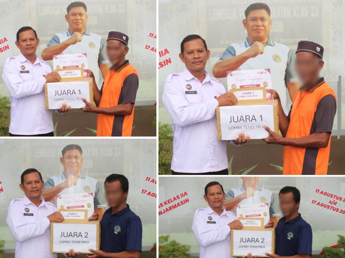 Suasana penuh semangat pembinaan di Lembaga Pemasyarakatan (Lapas) Kelas IIA Banjarmasin kembali terlihat pada Selasa (19/08). Kepala Seksi Pembinaan Narapidana/Anak Didik (Kasi Binadik), Gunadi, menyerahkan piagam penghargaan dan hadiah kepada para pemenang lomba bidang Tenis Meja dalam rangkaian Pekan Lomba Kemerdekaan RI ke-80.