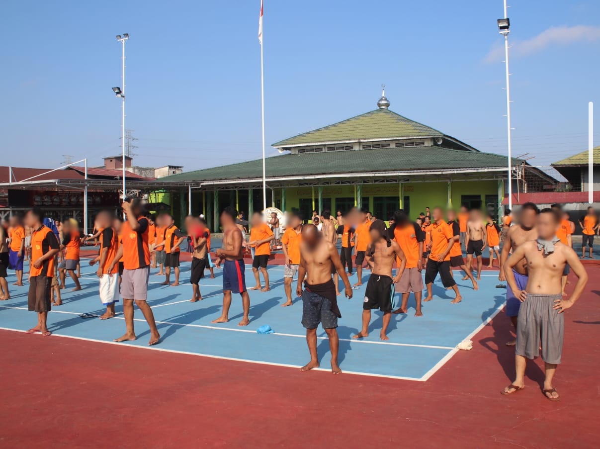 Warga binaan Lapas Kelas IIA Banjarmasin dari Blok E dan F tampak antusias mengikuti kegiatan senam pagi yang digelar di lapangan tengah lapas, Selasa (17/06). Kegiatan ini merupakan bagian dari program pembinaan jasmani yang rutin dilaksanakan untuk menjaga kebugaran fisik dan kesehatan mental warga binaan.