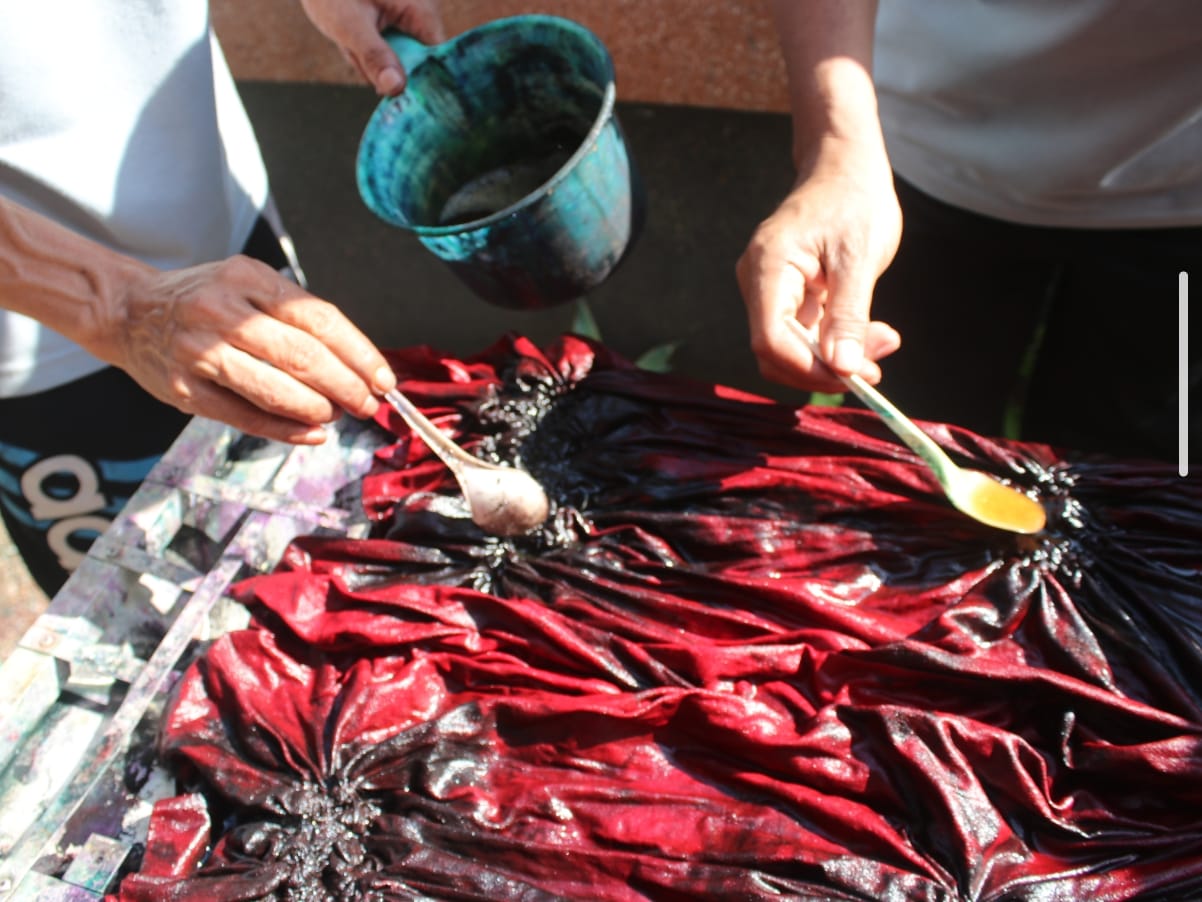 Kain yang diwarnai kali ini merupakan kain bermotif Dayak, hasil proses jelujur yang telah dikerjakan sehari sebelumnya. Pewarnaan menggunakan dua warna dominan, yaitu hitam dan merah, yang menjadi ciri khas kekuatan visual dari motif tradisional tersebut. Usai diberi warna, kain kemudian dijemur di bawah terik matahari untuk menguatkan hasil pewarnaan sekaligus mengeringkan kain secara alami.
