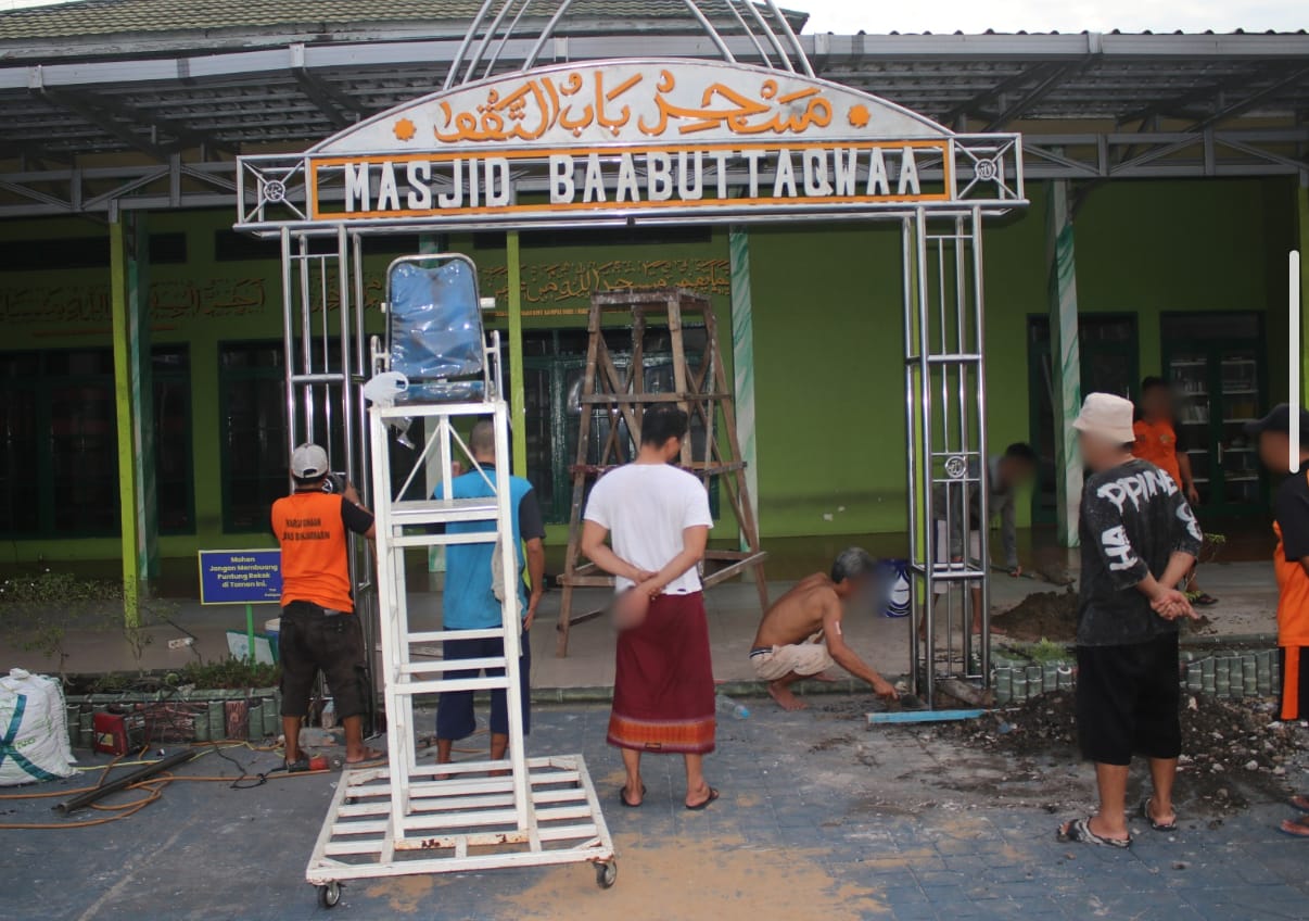 Setelah melewati proses pengerjaan selama 11 hari, warga binaan Lapas Kelas IIA Banjarmasin berhasil menyelesaikan pembangunan gapura Masjid Baabud Taqwa, Selasa (08/07). Gapura tersebut kini berdiri kokoh sebagai elemen baru yang memperindah tampilan depan masjid kebanggaan warga binaan.