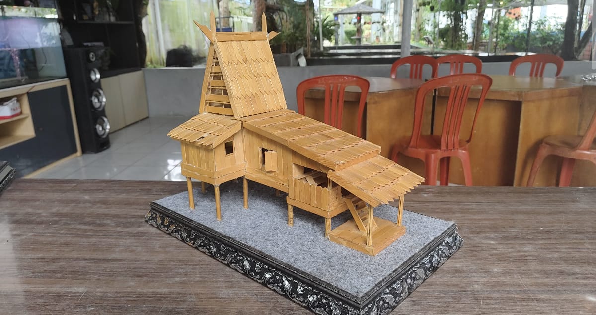 Rumah adat yang dikenal dengan ciri khas atap menjulang ini dikerjakan dengan detail dan ketelitian tinggi menggunakan bahan dasar stik es. Proses pembuatannya memerlukan keterampilan dalam mengukur, memotong, serta merangkai bagian-bagian rumah hingga menghasilkan bentuk yang presisi menyerupai rumah aslinya.