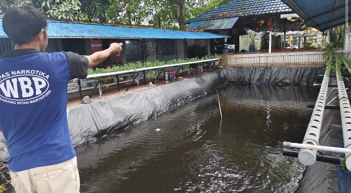 Dalam rangka mendukung program kemandirian serta ketahanan pangan di lingkungan pemasyarakatan, Warga Binaan Pemasyarakatan (WBP) Lapas Narkotika Kelas IIA Karang Intan rutin memberikan pakan ikan nila yang dibudidayakan di kolam dalam area lapas, Sabtu (31/5).